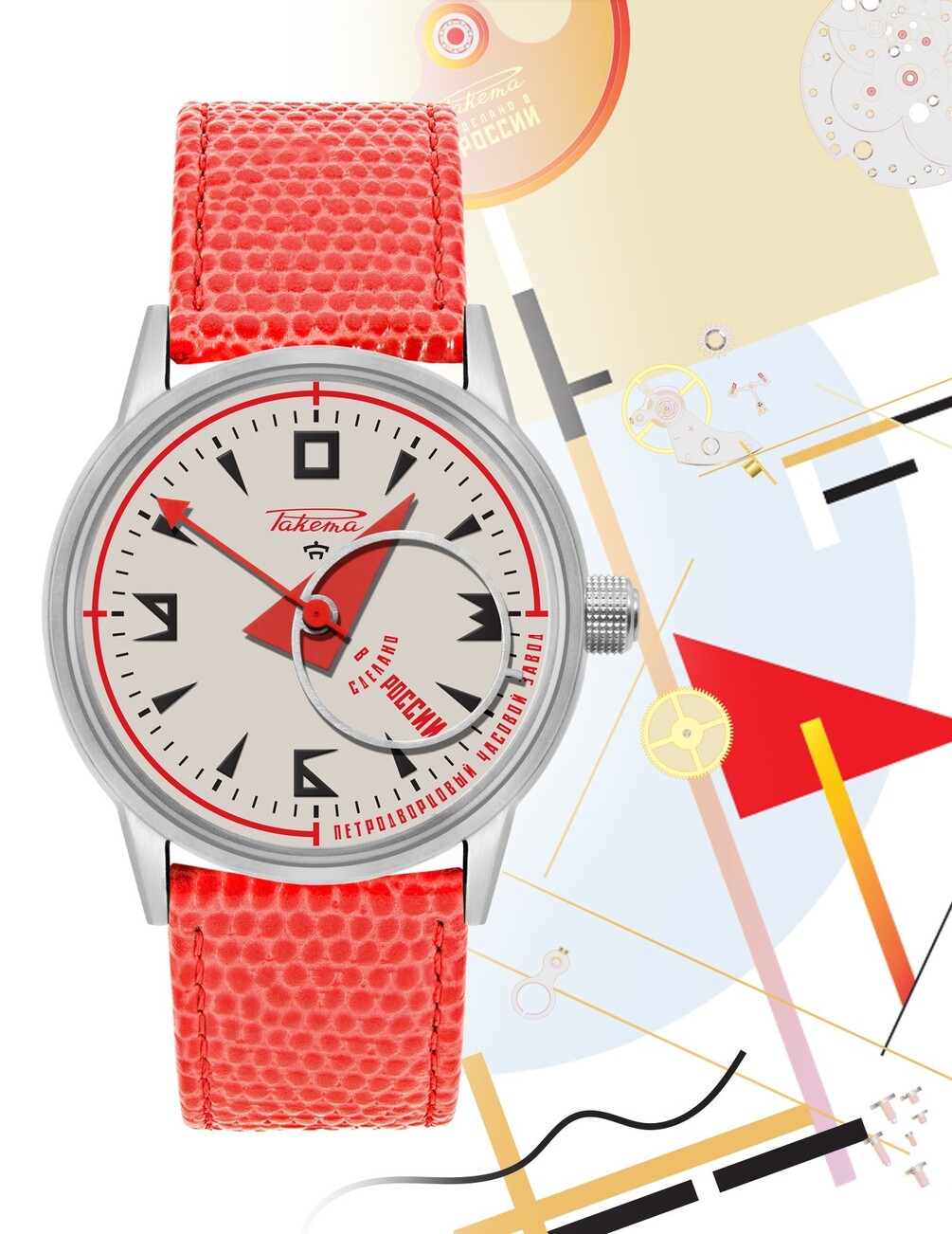 The new model of Raketa watches designed by Emir Kusturica is dedicated to 100th anniversary of Russian Avant-garde. Raketa “Avant-garde” is the new model of Petrodvorets watch factory with the bright design in the best traditions of Russian Avant-garde. The hands in the shape of circles and triangles are running on the dial. The energy for it is generated by the unique movement Raketa «Avtomat». It is the first time in 30 years that Russia comes up with a new automatic self-winding movement.